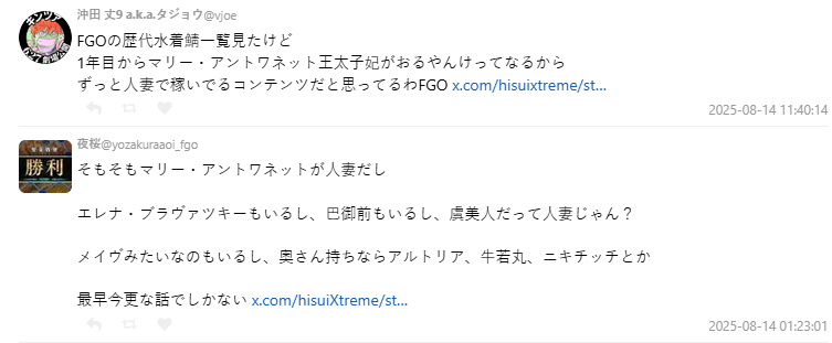 由於 FGO 世界觀以歷史人物為核心,許多角色在原本故事中都有婚姻或伴侶,因此已婚比例本就偏高。有玩家打趣說:「《少女與戰車》也是靠人妻延命的啊!」甚至有人腦洞大開:「照這趨勢,《學園偶像大師》到第十年可能會推出學生媽媽卡池。」