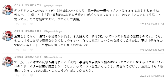 及川表示,這雖超出鷺巢的職責,但正是對創作者的尊重,「比法律程序更重要的是禮貌」。她強調,商業音樂必須重視這種禮數,否則無法稱為專業。