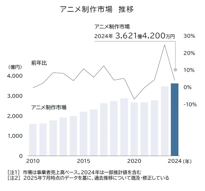 調查指出,2024 年動畫製作市場(以公司營收為基準)達到 3,621 億日圓,比前一年成長 4.0%,再度刷新紀錄。