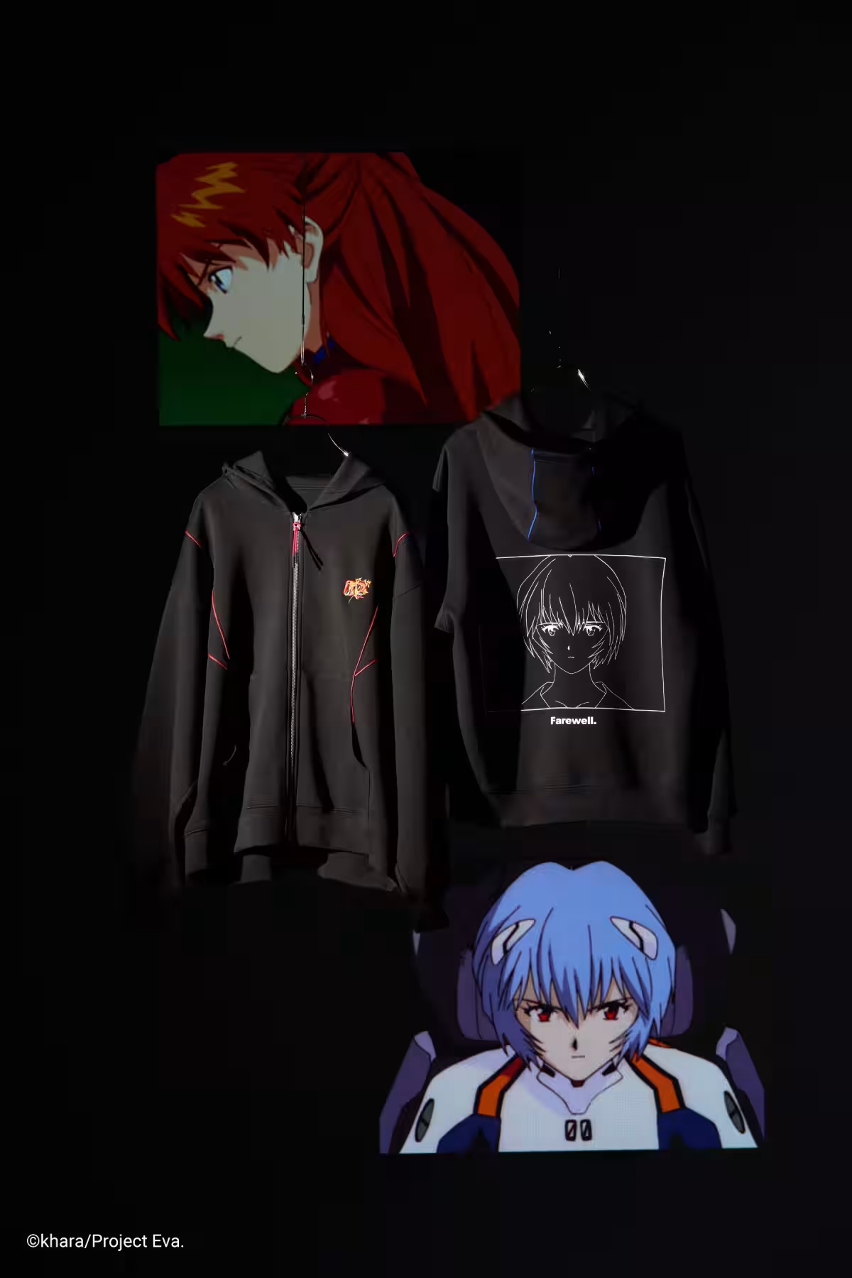 選取角色經典場景製作拼貼印花,採用 HARE 熱銷的聚酯材質,呈現動畫細膩畫風。有明日香與綾波零兩款。