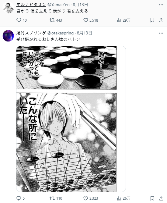 貼文引發許多網友感慨與回應,有人寫道:「你現在支持我,接下來換我支持你」、「大叔們的火炬一棒一棒傳下去」、「原來佐為一直都在啊」,也有人也認為《棋魂》:「傳承就是這部作品的核心」。