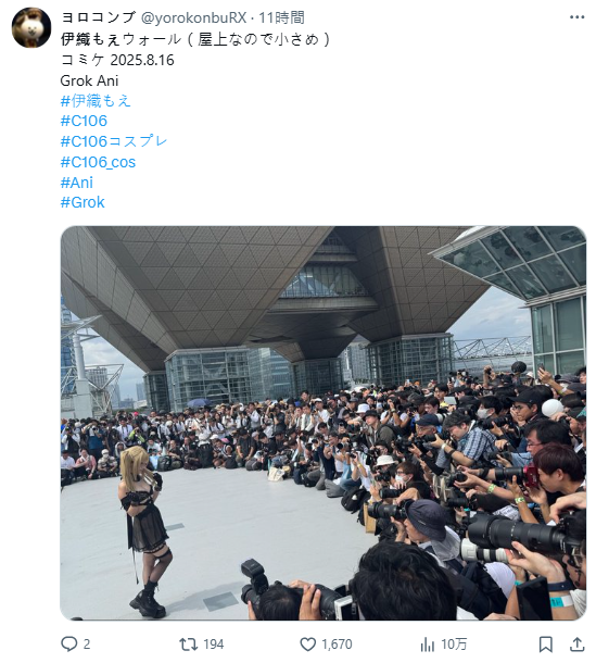 其中擔綱 Coser 數年,擁有姣好身材與極高人氣的伊織萌照慣例也在 C106 現身,這次她選擇的是七月推出掀起話題,XAI 推出的 AI 聊天應用程式 Grok 的『夥伴模式』角色 - Ani,性感的扮相擄獲各路相機,現場更是聚集大量人潮拍攝。