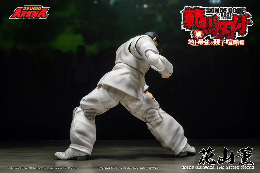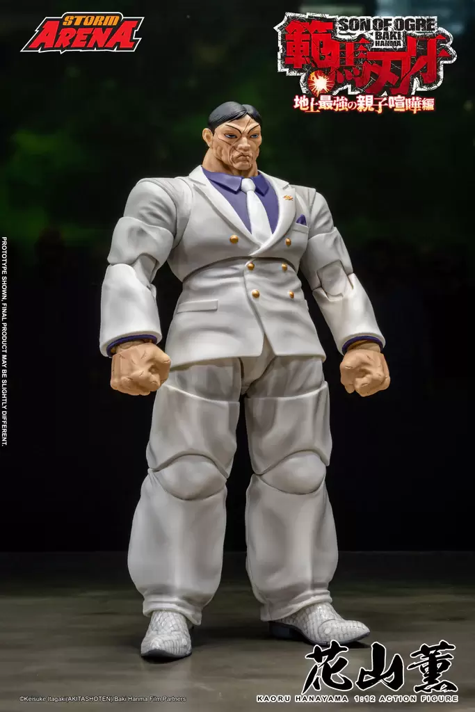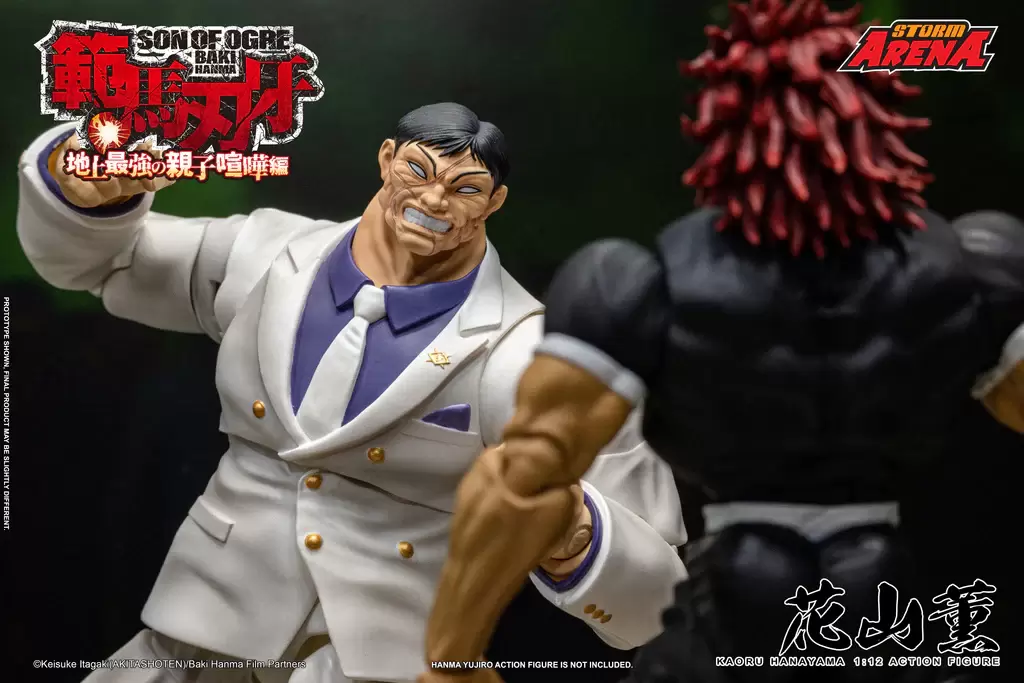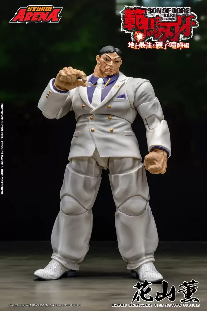 Storm Collectibles「STROM ARENA 花山薰」1/12比例可動人偶,以《範馬刃牙》第二季動畫「地上最強的親子打架篇」為基礎,將身穿標誌性白色西裝的花山薰立體化,還原充滿威脅性的魁梧身形,一雙巨大的手掌、聳動的疤面令人心驚膽戰!除了嚴肅的表情之外,還附有經典的白眼替換表情,並有眼鏡配件可以賞玩不同造型。另外還有多款替換手勢以及揮拳的透明特效零件,再現劇中讓人印象深刻的各種姿勢與對戰場面!