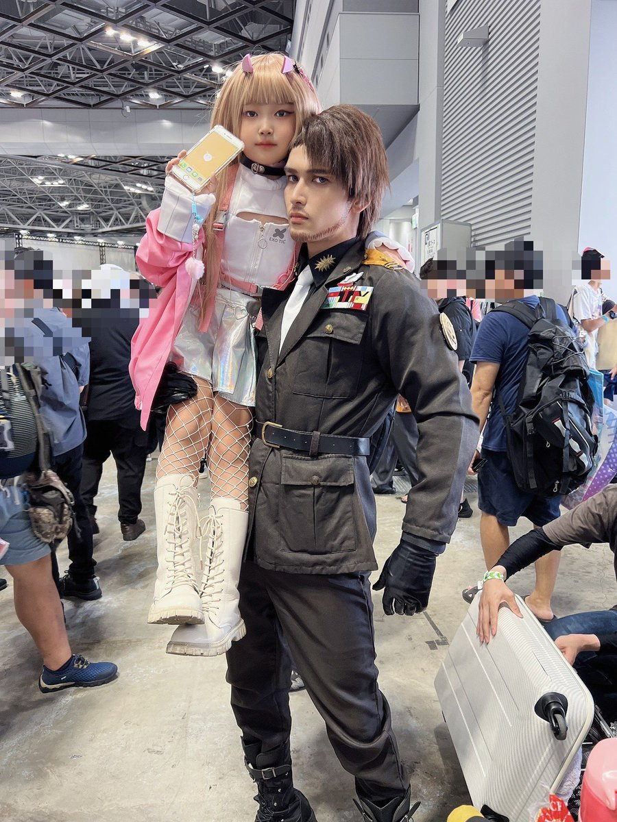 會場中還單手抱起了另一位 Cos 成《勝利女神:妮姬》毒蛇的推主 ( @avrillovekakao) 三歲女兒。