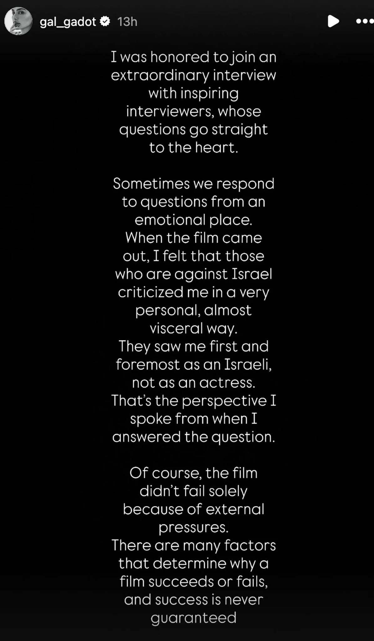 原本的採訪內容浮上檯面後,加朵隨即在 Instagram 的限時動態發文澄清:「我很榮幸能參與一場精采的採訪,接受一群採訪者問進心坎的訪問。有時候,我們回話總是感性出發,當這部電影上映時,我感覺那些反以色列的人士是很針對我在做出批評,他們主要是把我視為以色列人,而非一名女演員,這就是我回答問題時所抱持的觀點。當然,這部電影的失敗不僅僅是因為外部的施壓。一部電影的成功或失敗,是基於很多因素的,而成功也絕非是必然的。」