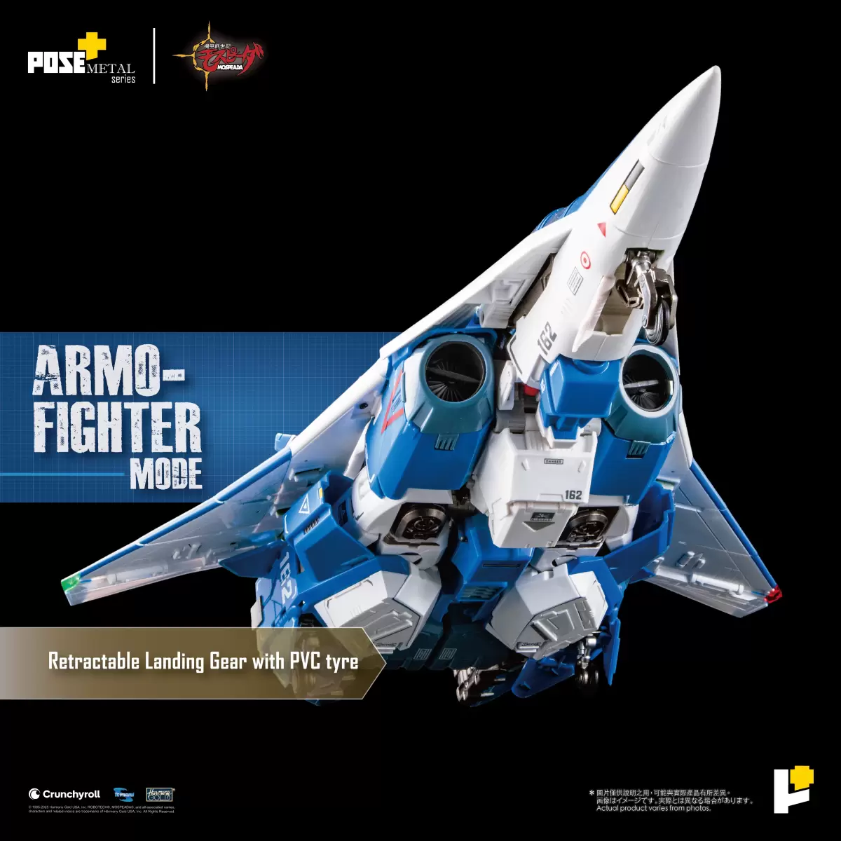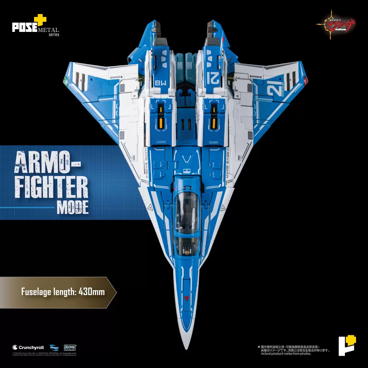 「POSE+METAL 1/28 AFC-01H LEGIOSS ETA」擁有全高 33 公分、重約 1.7 公斤的魄力規格,以細膩造型、豐富的色彩塗裝與機身標誌印刷,再現極具厚重感的裝甲造型、史迪克專用機特徵的藍色機身、雙眼型頭部造型。全機採用多數合金零件製作,以高強度的可動關節再現「Armo-Fighter(戰機)」、「Armo-Diver(中間形態)」、「Armo-Soldier(機器人)」三段變形機構。