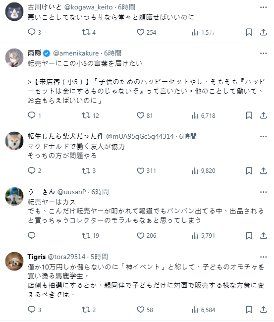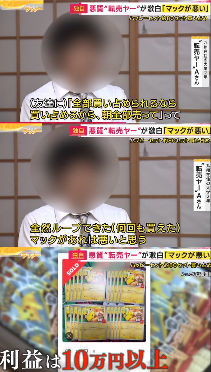 受訪的是位住在九州的 20 歲大二生同學,他平時就靠轉賣球鞋、衣服,一個月能賺 20 萬日圓。這次聽到寶可夢卡牌活動,立刻揪朋友一起搶購,總共入手 70~80 套快樂兒童餐,再把卡牌用原價 4~6 倍的價格轉賣,有些甚至賣到海外,輕鬆賺進超過 10 萬日圓。