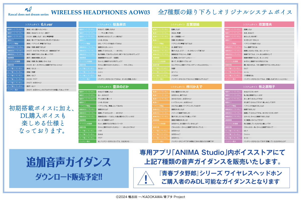 這次由各角色聲優各角色聲優全新錄製的語音引導,使用者可以在「櫻島麻衣」、「古賀朋繪」、「雙葉理央」、「豐濱和香」、「梓川楓」、「牧之原翔子」以及「全員ver」中選一組,耳機出貨時就會直接內建選好的聲音,也都會配置對應的包裝盒裝。