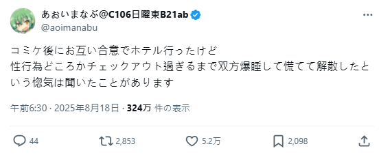 起因是有推主指出,聽說有男女在 Comiket 結束後,雙方合意一起去旅館開房間。本以為會有浪漫進展或是擦槍走火,結果兩人累到什麼都沒做,竟然一路睡到退房時間才驚醒,最後匆忙各自回家。