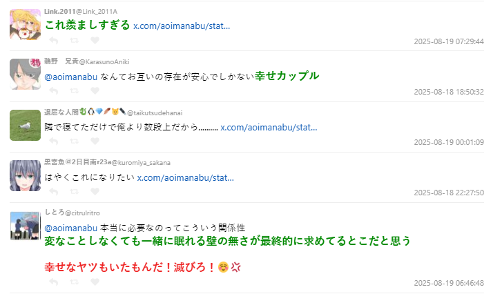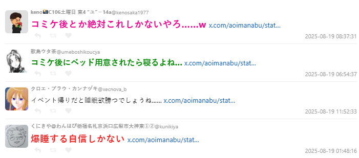 除了笑聲連連,也有網友覺得能這樣一起參加 Comiket,反而很甜蜜,「能累到安心睡在彼此身邊,本身就是幸福了」、「這才是真正理想的關係吧」、「這比什麼都甜」。甚至有單身的網友忍不住喊:「好想早點變成這樣!」、「這種才是真正的最上級放閃,爆炸吧!」