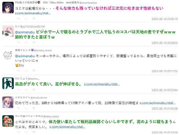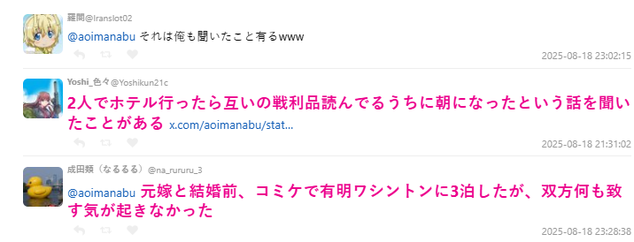 這則貼文很快引起網友熱烈回應,大家一致認為這樣的情況完全不意外。有人笑說:「 Comiket 後只會發生這種事啦!」、「床擺在眼前不睡才奇怪」,也有人吐槽:「跑完活動哪有時間開房間擦槍走火,先睡再說」、「一夜情?不,是一夜睡。」