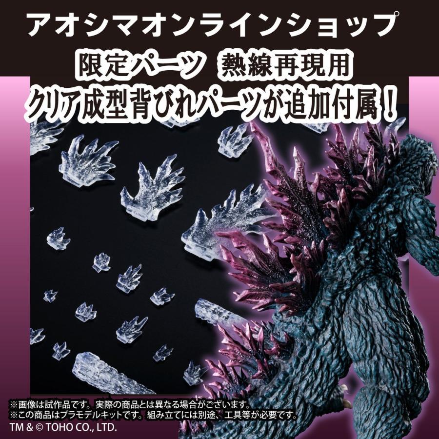 商品包裝盒繪則由曾繪製萬代多款鋼普拉盒繪的插畫家「TAKA-F」製作,呈現怪獸王大肆破壞後、佇立於火光廢墟之中的英姿。此外於官方網路商店「AOSHIMA ONLINE SHOP」訂購此商品,還將附贈限定特典「透明成型色背鰭零件」一組,能夠自行上色再現「放射熱線時的發光」等質感。