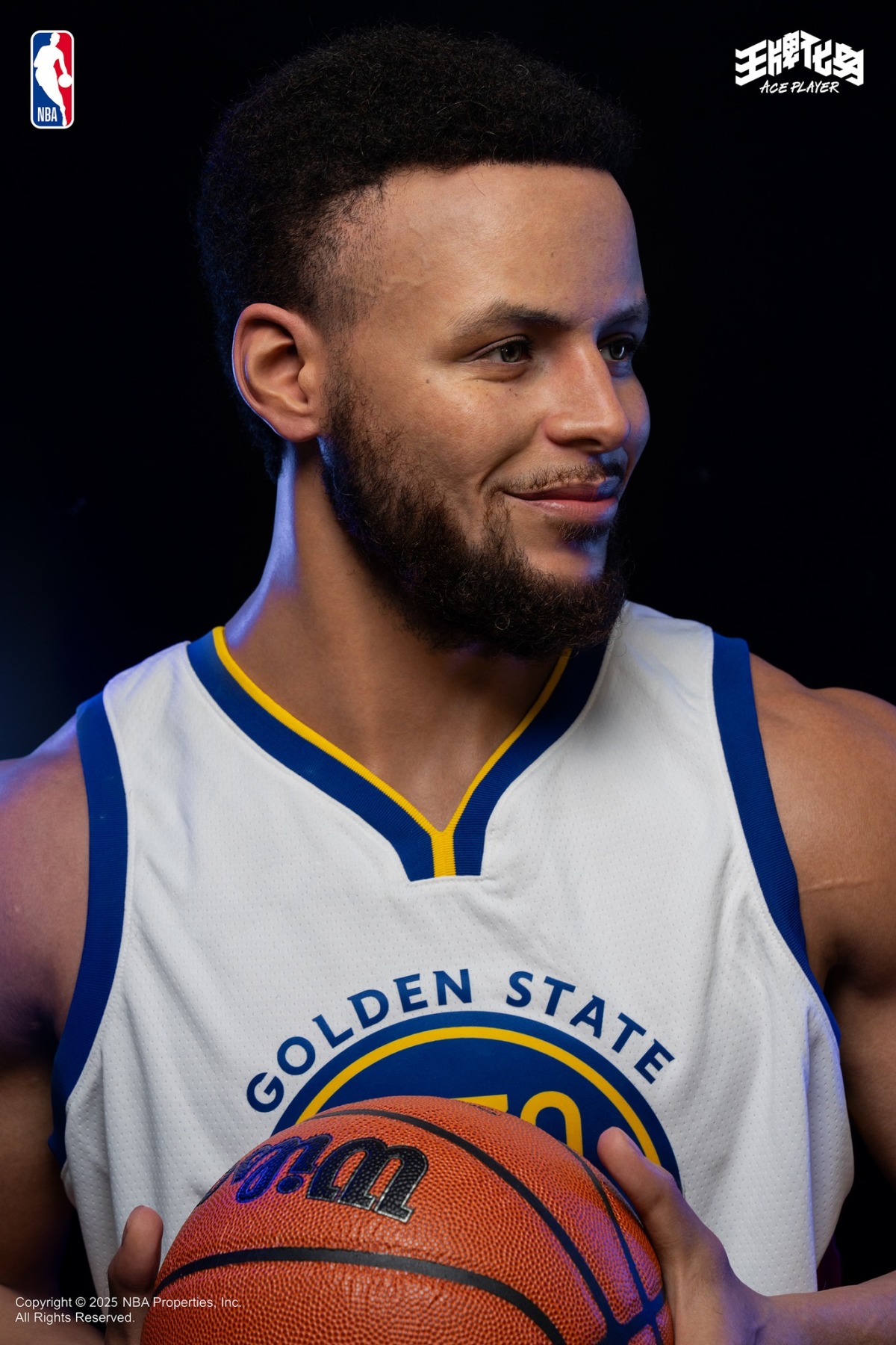 『ACE PLAYER Stephen Curry 史蒂芬·柯瑞 1/1真實比例胸像』,以 Curry 的身體比例為基礎,打造出彷彿與籃球巨星近距離接觸的震撼體驗!使用高度耐熱、耐老化的鉑金矽膠(Platinum Silicone)製作皮膚,呈現出宛如真人的膚質紋理與細紋,包含臉上的雀斑、血管、青筋,以及自信笑容的微笑紋等。加上矽膠植髮技術純手工植入的高仿真的高溫纖維髮絲,先經捲曲定型,完美重現Curry標誌性的髮型與鬍子!