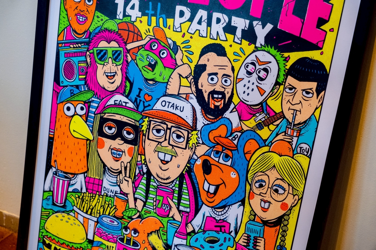 This silkscreen art print is packed with references to iconic pop culture from the 1990s — from legendary basketball superstars, to pizza-loving mutant turtles, and even a logical alien giving the Vulcan salute. It’s a playful tribute to classic toys, movies, and cultural touchstones.