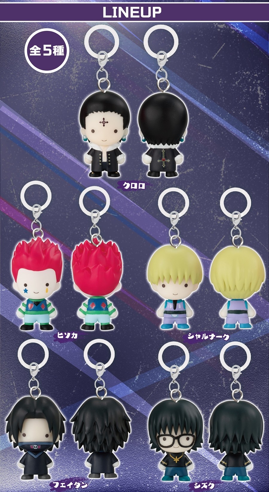 GASHAPON「HUNTER×HUNTER 標記吊飾 幻影旅團篇」轉蛋,將幻影旅團人氣角色以約 3~4 公分的小尺寸吊飾再現,收錄有:庫洛洛、西索、飛坦、俠客、小滴,採用呆萌的豆豆眼Q版造型,服裝與充滿個人特色的細節非常可愛~重複登場的西索也換上新的服裝。附有橡皮環,可以將吊飾套在雨傘、水瓶等物品上,也能直接扣在拉鏈等處作為裝飾。