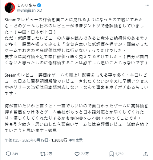 一名推主しんじさん 在 X 上分享自己的觀察指出,日本評論看起來超嚴苛,但仔細看留言內容,其實大多言之有理。他認為真正的原因在於,「遇到不滿就去按低分,但就算覺得遊戲好玩,也不會特地去按高分」。因此在數字上,日本看起來就顯得特別「毒舌」。