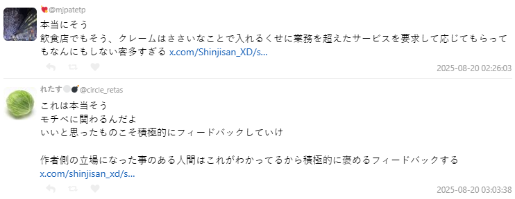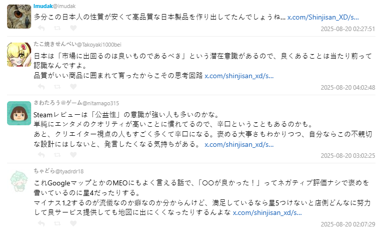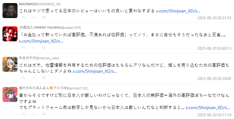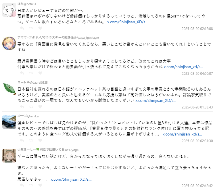 這篇貼文引來大批回響,不少網友表示日本人真的太少直接說「好就是好」,也有玩家反省自己常有「只在不滿時才給差評」的習慣。不少玩家也認為,日本玩家的「無評價」其實就等於海外玩家的高分,但平台只看數字,就誤以為日本人很苛刻。