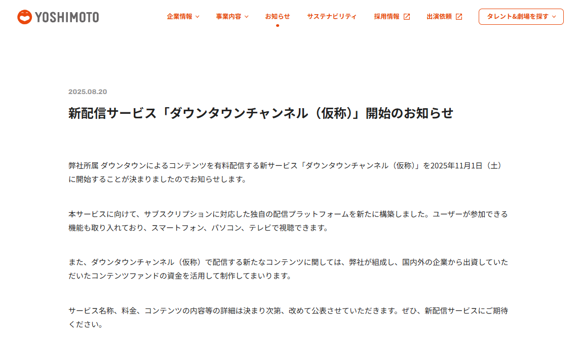 根據吉本興業網站公告,「DownTown Channel」這個平台是全新打造的自有串流系統,支援訂閱制,不論是手機、電腦還是電視都能收看,還加入了讓觀眾能互動參與的新功能。