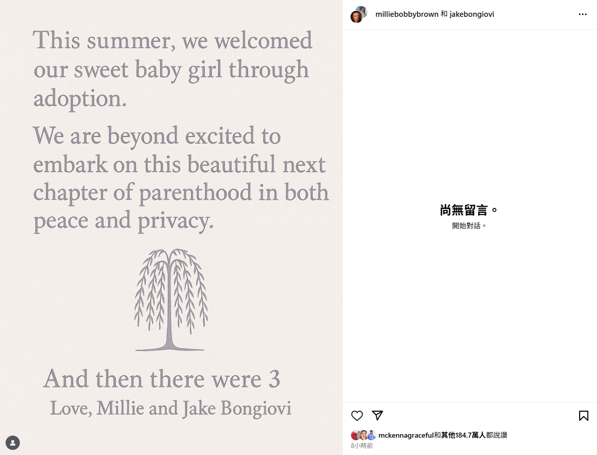 因《怪奇物語》(Stranger Things)的「11 號」一角走紅的米莉芭比布朗(Millie Bobby Brown),自成名以來就一直被認為非常早熟,她年紀輕輕就享有製片人的身份,20 歲就和「邦喬飛」樂團的主唱-瓊邦喬飛(Jon Bon Jovi)的兒子傑克邦喬飛(Jake Bongiovi)步入婚姻,人生進度遠遠超車許多同輩。而現在 21 歲的她,還已經成為了一名母親。