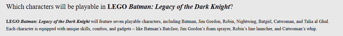 TT Games 製作總監 Jonathan Smith 在接受《IGN》訪問時表示,團隊希望「完整呈現布魯斯·韋恩的旅程與哥譚市的氛圍」,因此縮減角色名單,以打造更細緻且以劇情為導向的體驗。