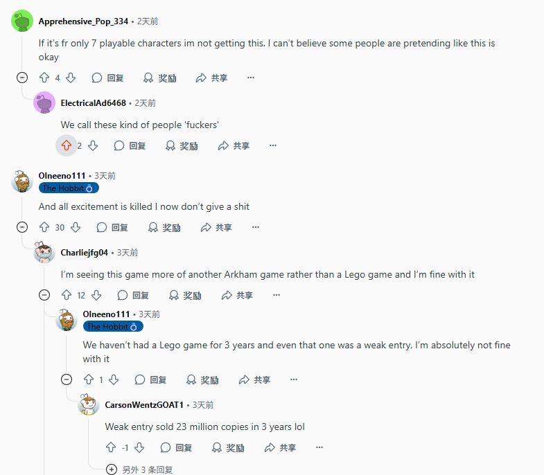 這一改動迅速在網路上引起爭議。一些玩家批評「樂高遊戲的樂趣就是收集與操作大量角色」,更有人直言「只有七人根本不買」。