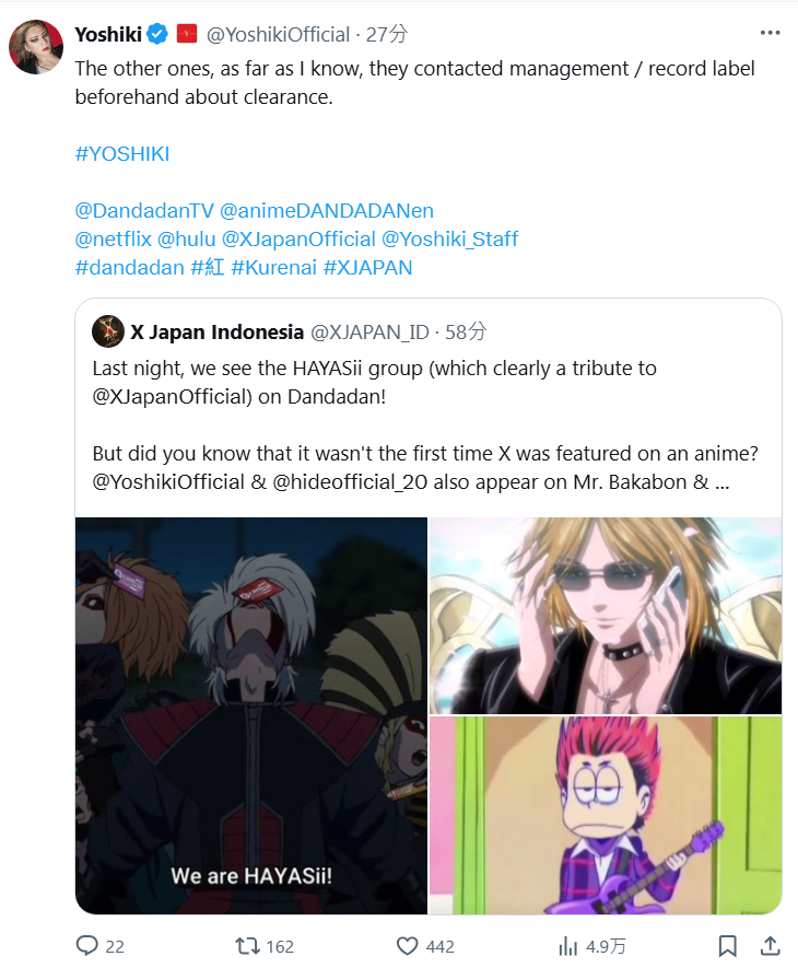 當然當初 YOSHIKI 也提到,其實就是沒有事前聯繫的關係,才會發生自己不知道,連律師都來聯繫的窘況。其實自己對於這樣的合作都很樂見,過去也和不少動畫以這樣的方式登場過,也都沒有任何問題。