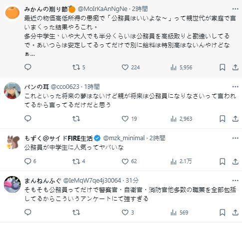 不過對於這樣的調查結果,不少網友認為不太妥當,畢竟現在日本物價可說是漸漸升高,日幣還貶值明顯,公務員這種死薪水其實不高也不容易提升,如果年輕人把它當作憧憬工作目標,只能說太可惜沒有更具創造力的目標。