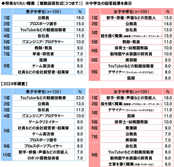 調查結果顯示,女生國中生心中最憧憬的職業是藝人、聲優或是歌手,第二名則是公務員;而國中男生則普遍以公務員為第一名,第二名則是職業運動選手,第三才是去年為冠軍的 YouTuber 影片創作者。