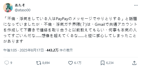 近日日本 X 上掀起熱議,不少網友爆料,外遇或偷吃族群除了會用電子支付 PayPay 的訊息功能來隱密聯絡外,更有「進階版」的做法使用 Gmail 來操作的,讓不少網友驚呼偷吃真的是千方百計盡出。
