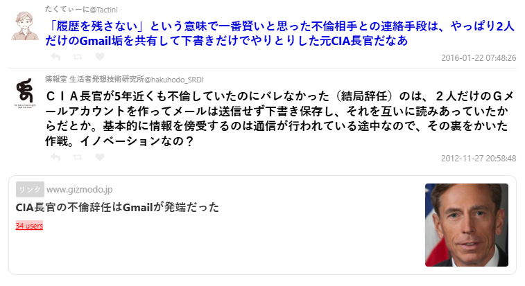 事實上,日本網友也點出 Gmail 這招早有「實戰案例」。2012 年曾傳出,某 CIA 長官靠著這種 Gmail 草稿互傳的方法,與婚外情對象維持祕密聯絡多年,因為草稿並不會經過傳輸過程,因此難以被攔截。直到醜聞曝光前,手法一直未被發現。