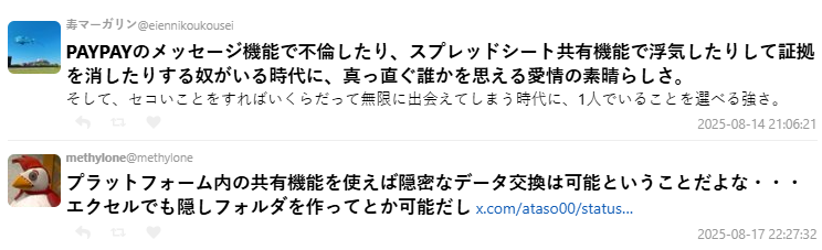 這就是所謂「用 PayPay 偷吃」的真實案例,透過互相支付的方式來通訊,畢竟用這種電子支付來說比較不容易被搜查。