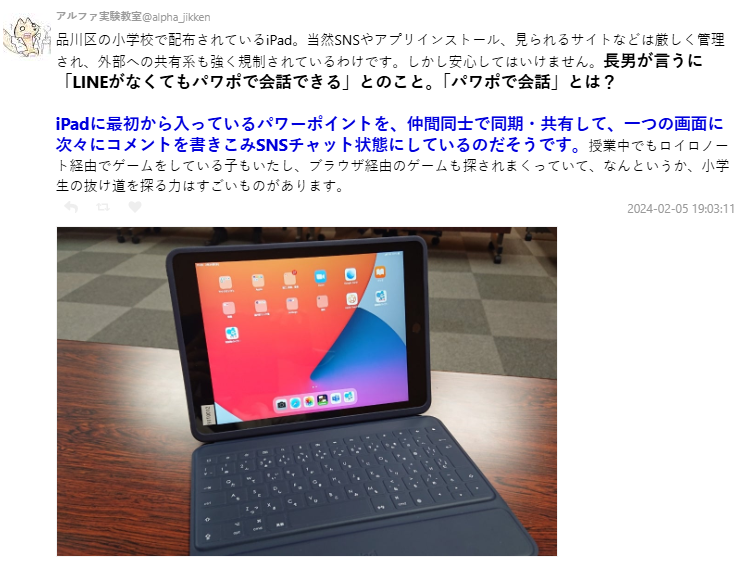 還有學生族群發明「用 PowerPoint 當聊天室」,因為日本學校發的 iPad 全部社群跟下載都封鎖,但他們發明「用 PowerPoint 傳訊息」的玩法。大家一起編輯同一份 PPT,直接當聊天室用,還能同步跨校聊天。有些甚至用來傳遊戲或上課偷玩,真的佩服小孩的生存智慧。
