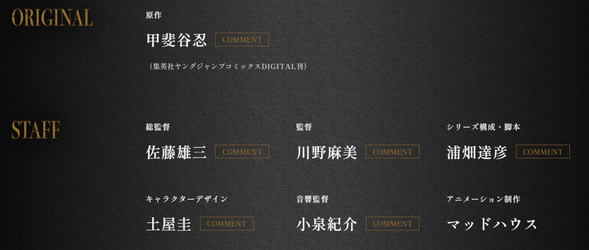今年正好是原作連載滿20週年,也成了動畫化宣布的最佳時機。這次的動畫版將由佐藤雄三擔任總監督,川野麻美擔任監督,浦畑達彥負責系列構成與劇本,角色設計則由土屋圭擔綱,音響監督小泉紀介,並由打造《葬送的芙莉蓮》與《地。-關於地球的運動-》的 MADHOUSE 全力製作。