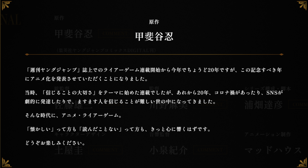 「《LIAR GAME》從開始連載到現在剛好滿 20 年,能在這一年宣布動畫化,我真的很感慨。當初創作時想傳達『相信別人的重要性』,但20年過去,經歷疫情、SNS發展,社會好像變得更難互相信任。在這樣的時代裡推出動畫版《LIAR GAME》,不管是覺得『好懷念』的舊讀者,還是第一次接觸的新觀眾,我相信都能有所共鳴,請大家拭目以待!」