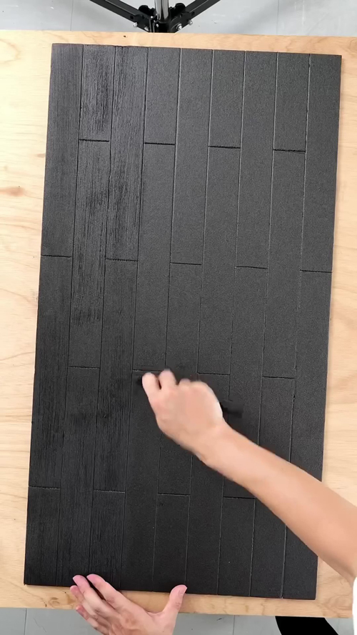 首先,他用黑色板材切割,再上茶色顏料,做出像木質地板的效果。
