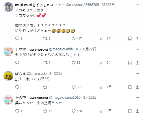 貼在 X 上後立刻引起不少網友大讚關注,不過這蛋糕雖然造型很到位,不過許多網友也反映蛋糕商品就叫個「蟲」字,這實在有點讓人感到怕怕的阿 w,而原 Po 則表示真的很好吃,內心雖然中空但甜而不膩,非常推薦。