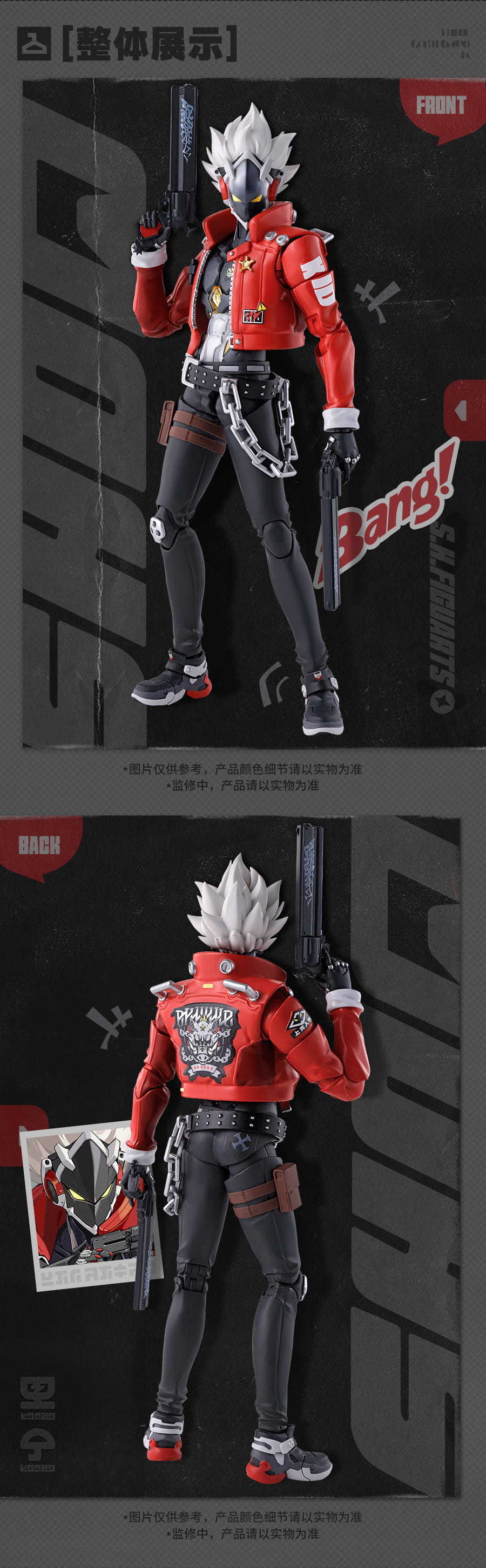 同時全身也具備精密的可動分割設計,在不影響造型完整性的情況下,能自由把玩各部關節。配件部份則附有三種替換表情零件、三對替換造型手掌,以及比利特徵的雙槍武裝,能夠再現帥氣的戰鬥姿勢。