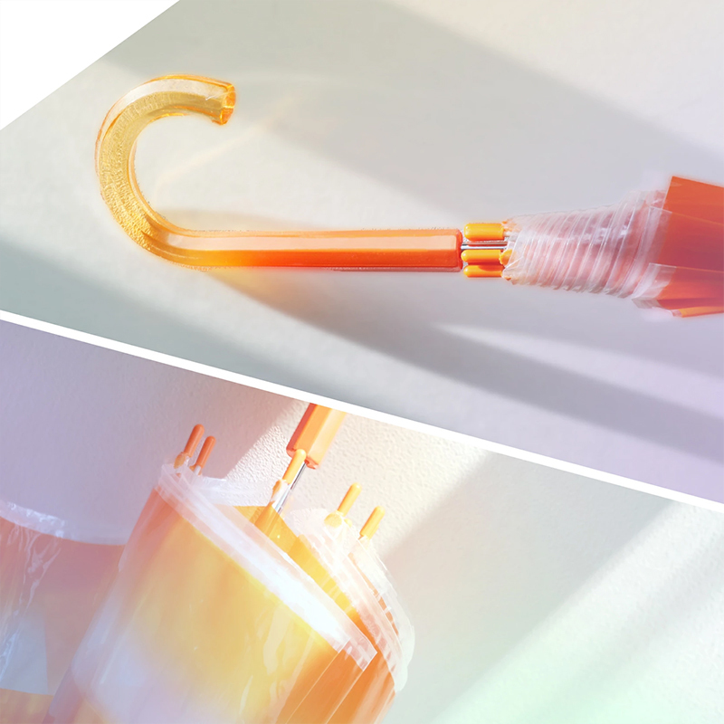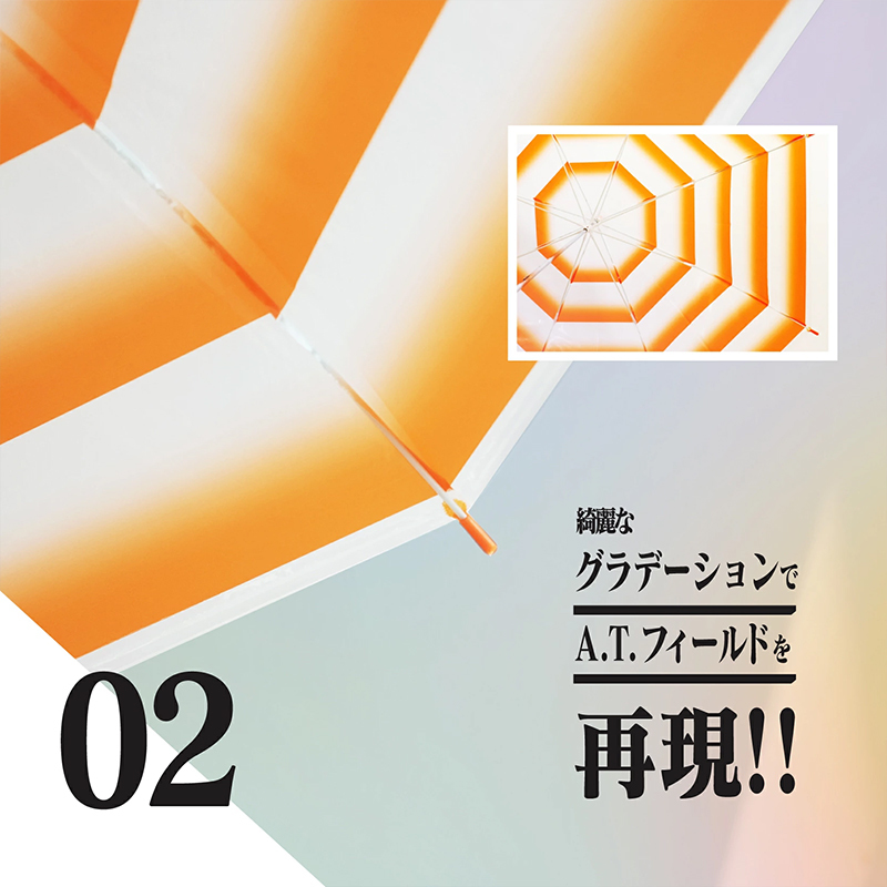 「A.T.力場 60公分雨傘」將劇中標誌性的A.T.力場設計成雨傘,在岡本製造的透明傘面上印刷有鮮豔的橘色漸層八角形,綺麗的色彩徹底展現劇中A.T.力場全開的氣勢!傘骨長度為 60 公分,並採用透明材質打造,傘柄的橘色透明設計更是讓整體質感再提升;傘的支骨使用具彈性特質且輕巧的玻璃纖維,支撐102公分的傘面,重量僅有 355 g重,卻不失防風性與耐久度。買了這把傘,或許就會期待雨天能撐出去展現A.T.力場啦!不只能阻擋雨滴,還能阻擋雨天造成的壞心情~