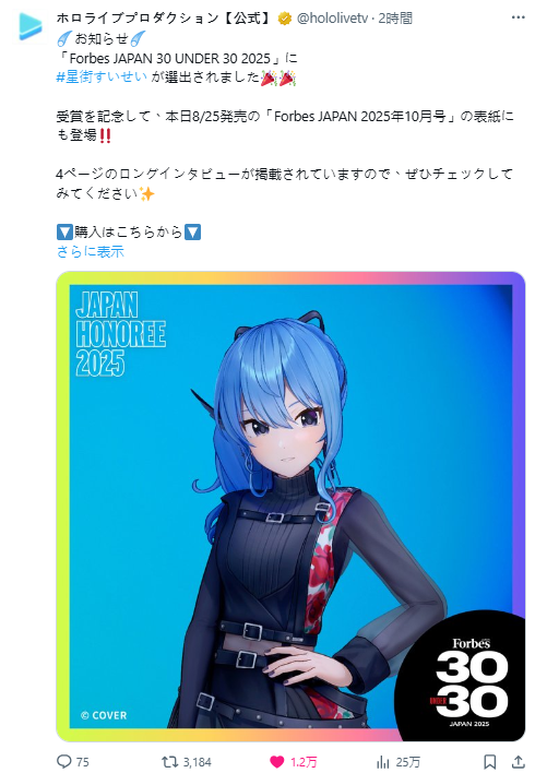 《日本富比士雜誌》(Forbes JAPAN)連續八年都會以「未滿 30 歲改變世界的的 30 個人」(30 UNDER 30)為主題選出人才,今年的封面人物是就是「星街彗星」,當然也在入選名單。