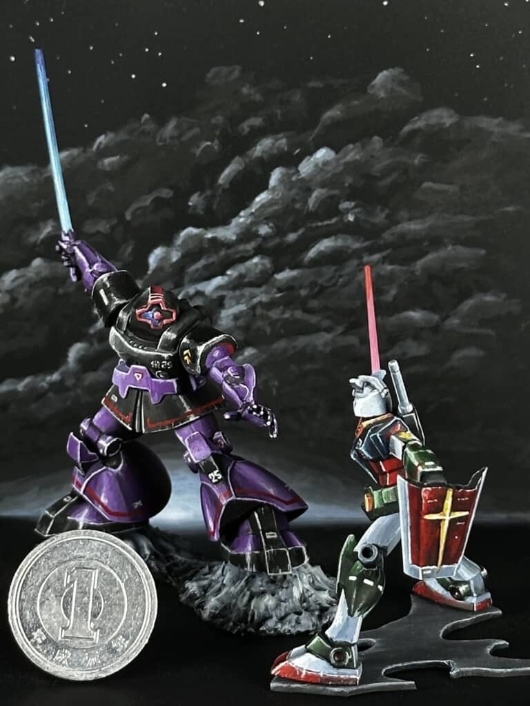 從顏色到塗裝的風格、台座、背景和擺設的姿勢全都完美還原,簡直就像是從海報中拿出來一樣,而推主也為了做大小比較把日圓一元硬幣放旁邊,你就知道這大小要進行這樣的塗裝有多費工了,不過能還原這經典海報圖也算是值得了。
