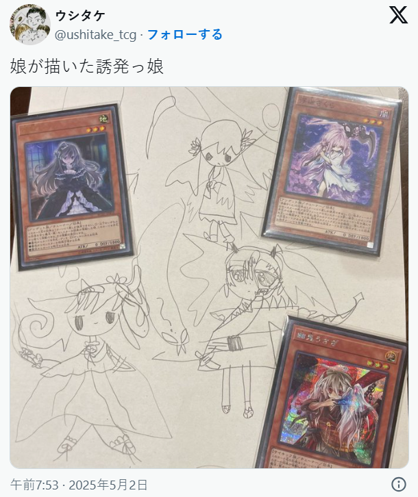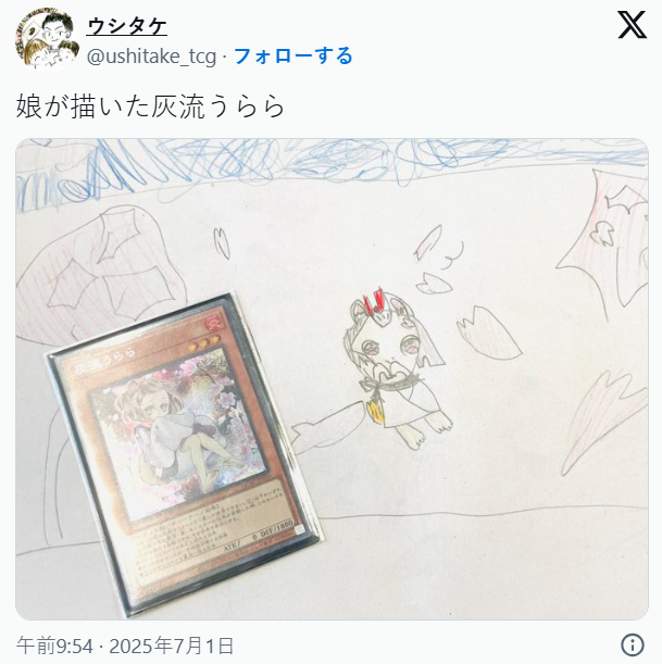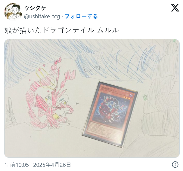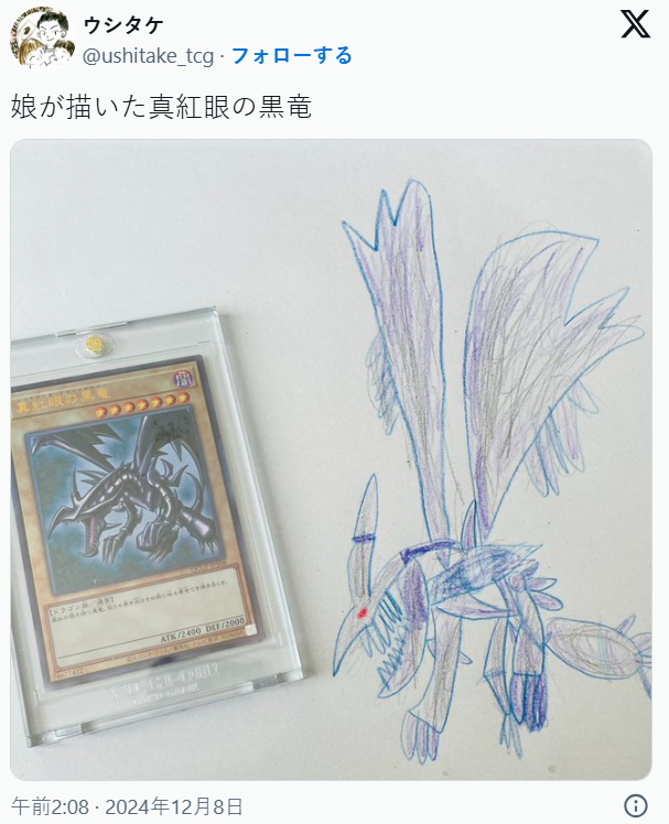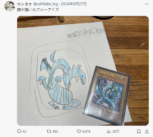 這位爸爸推主ウシタケ(@ushitake_tcg)平常就很愛玩遊戲王卡牌,因為女兒也會看著他玩,不時隨手拿他的卡牌去畫圖,在去年就曾經畫了一張「青眼白龍」,充滿童趣的畫風讓不少網友稱讚。