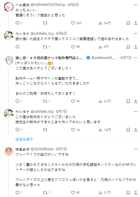 據ウシタケ所說,女兒是自己從爸爸的牌組裡挑出想畫的怪獸,再一張張畫下來。爸爸則是把這些插圖一一拍照,整理成圖片,再透過客製化周邊服務,做出了這張專屬的對戰桌墊。