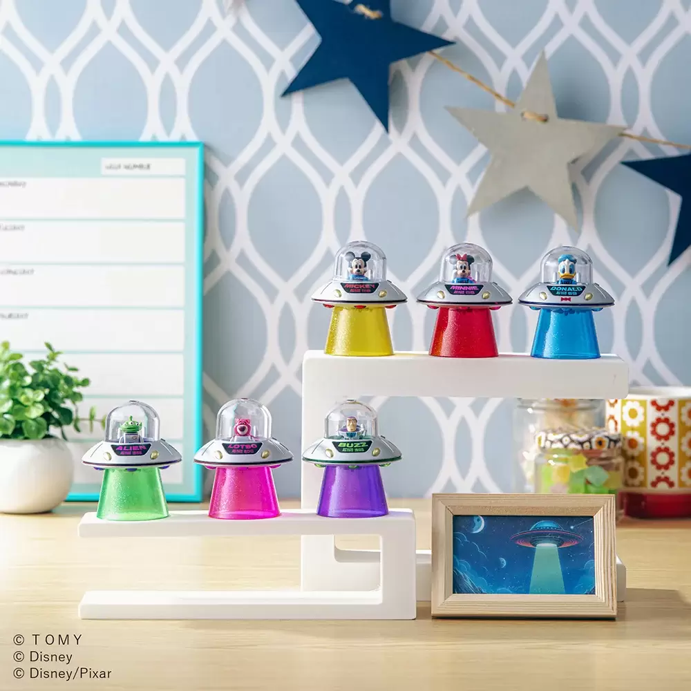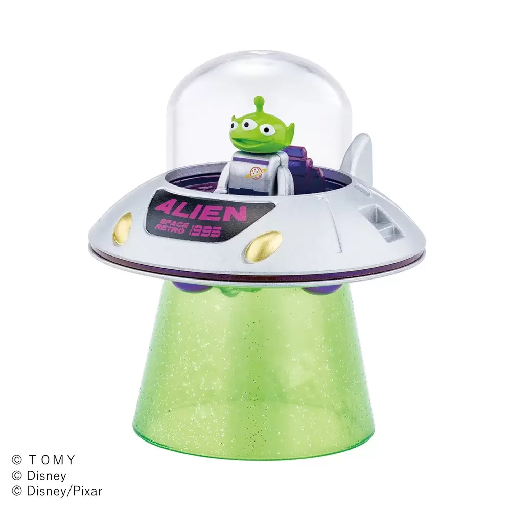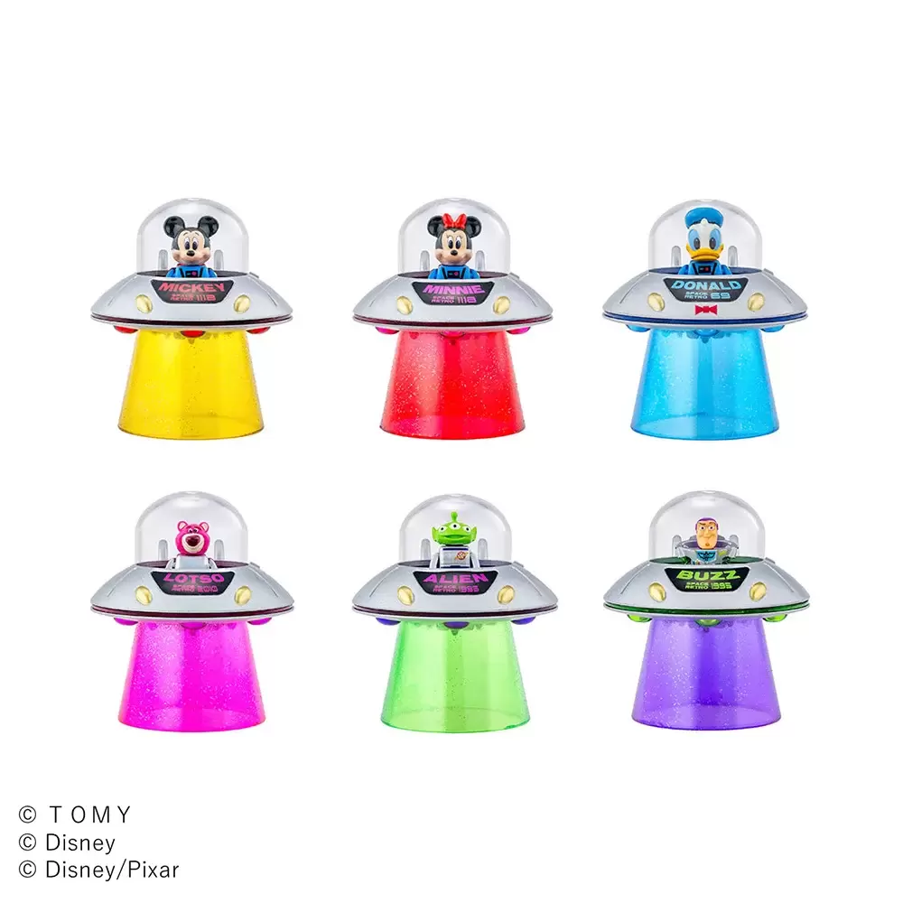 乘坐在懷舊造型的幽浮UFO上,採用壓鑄工藝製成,頗具份量之外,上面還印有各角色的英文名稱!更有趣的是,底部設計有繽紛色彩的光束底座,佈滿了閃閃發光的亮片,用智慧型手機或其他設備從下方照射時,光線還會透過駕駛艙,營造出神秘的氛圍!增加了不同的玩法~