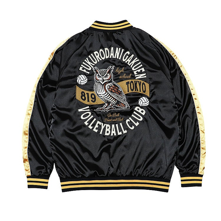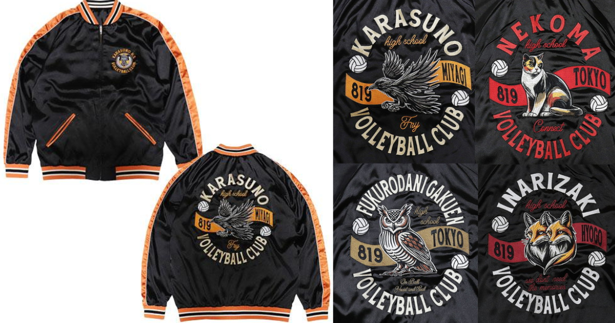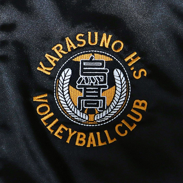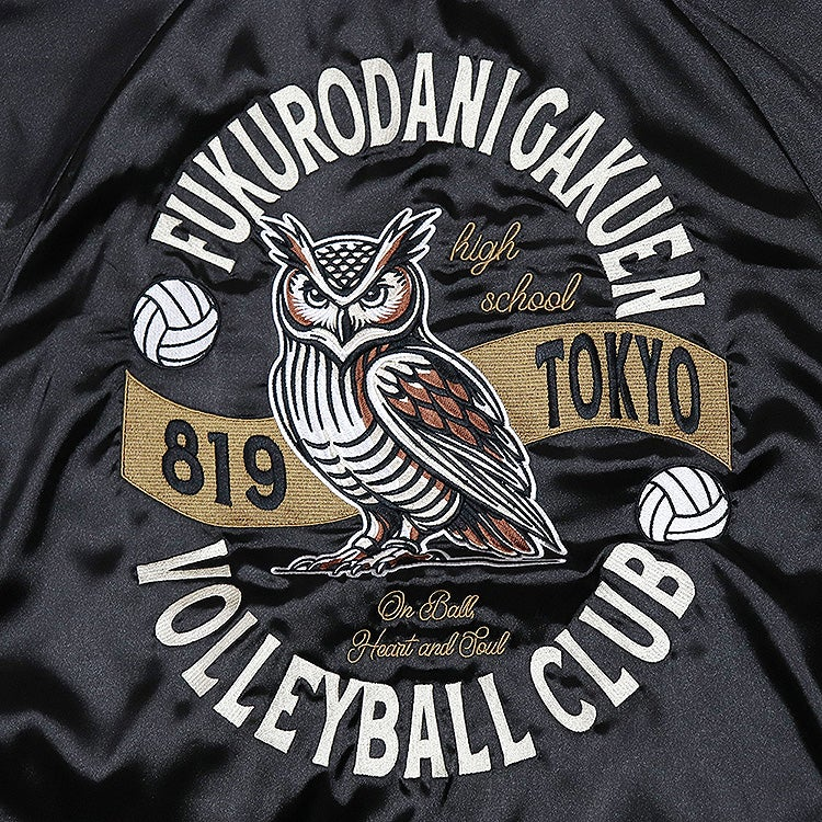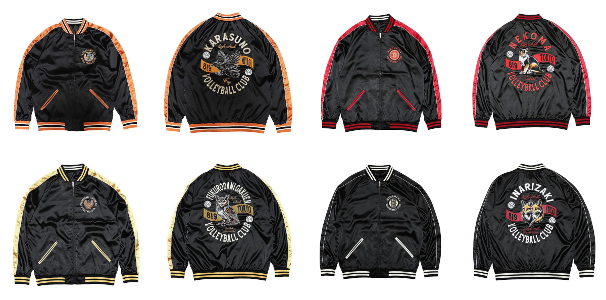這次的刺繡橫須賀外套是以烏野高中、音駒高中、梟谷學園、稻荷崎高中四所學校為設計靈感。外套本體正面於左胸配置了各校的校徽圖案,背面則分別設計了烏鴉、黑貓、貓頭鷹、狐狸等各校代表動物圖案。