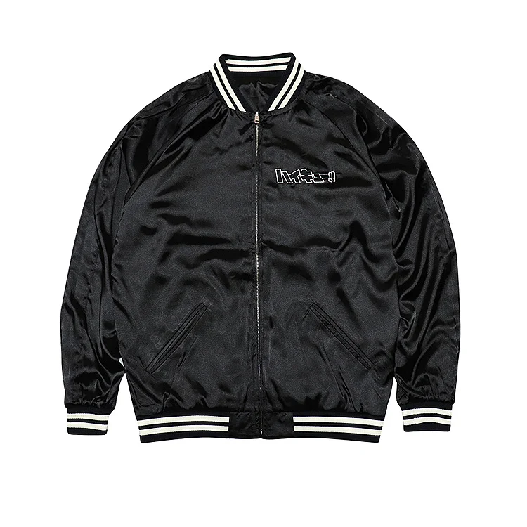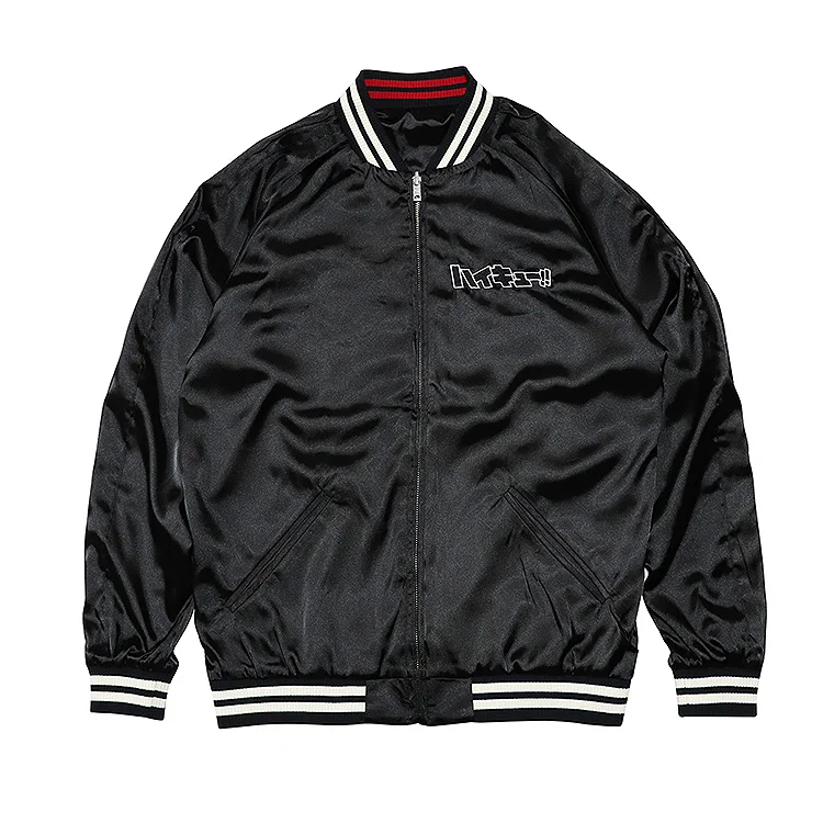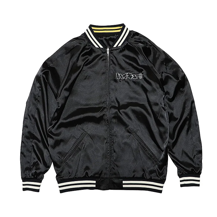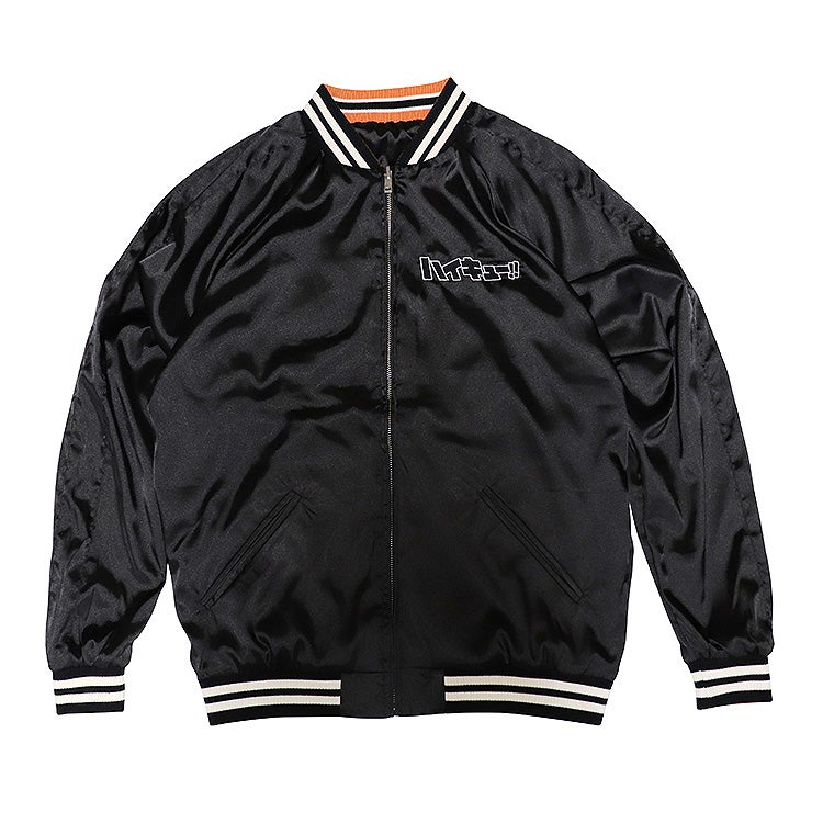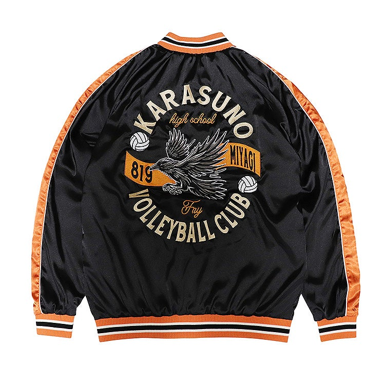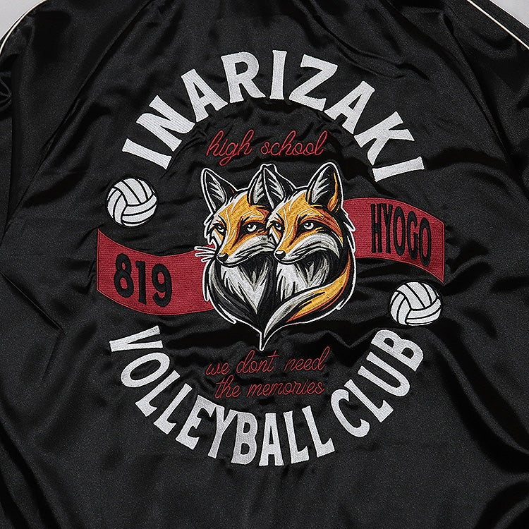 這次的刺繡橫須賀外套是以烏野高中、音駒高中、梟谷學園、稻荷崎高中四所學校為設計靈感。外套本體正面於左胸配置了各校的校徽圖案,背面則分別設計了烏鴉、黑貓、貓頭鷹、狐狸等各校代表動物圖案。