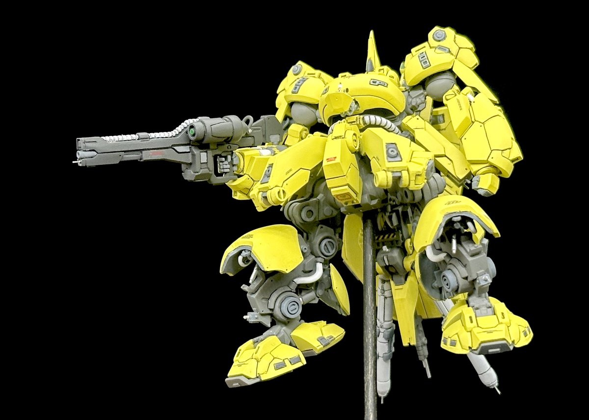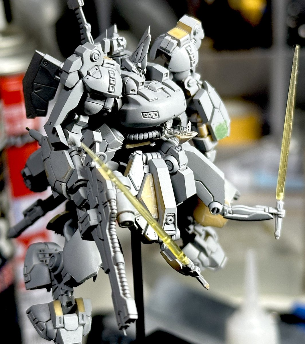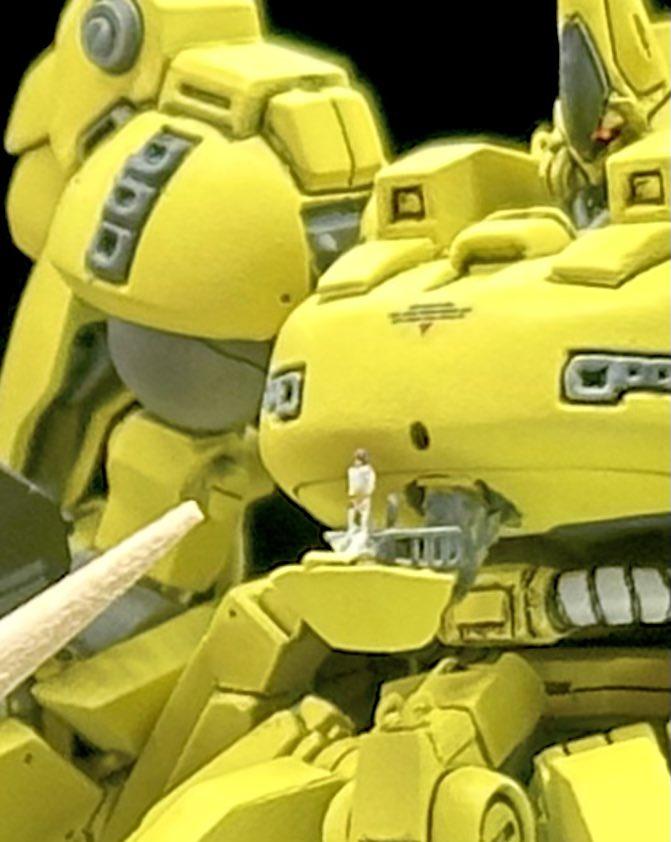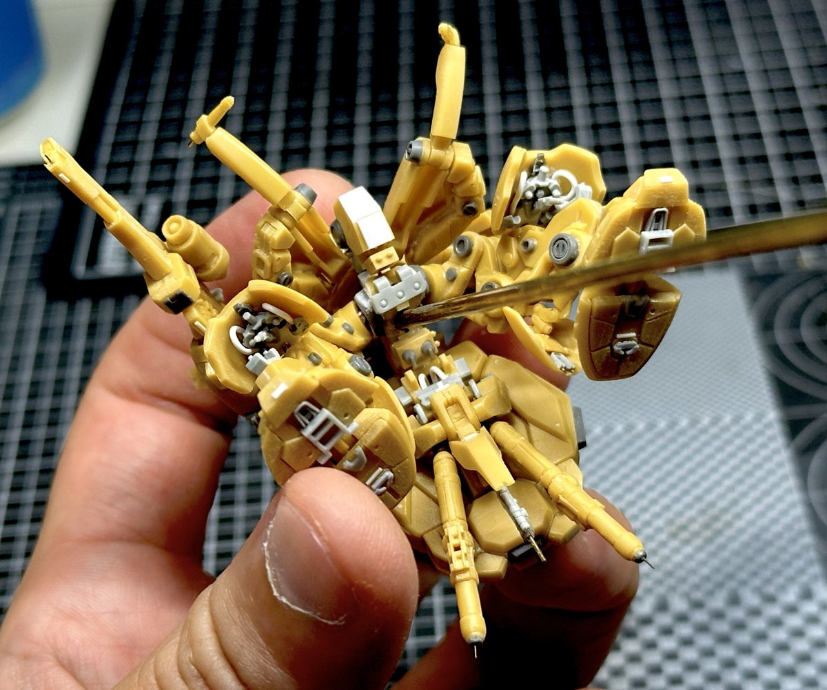 除了塗裝外,他還特別在駕駛艙捏了一隻迷你到不行的西羅克在上面,原本打算在背包裝 LED 燈,不過後來作罷。再把粗糙的地方打磨處理,還加了一些細節刻線。重新上漆後再細膩的塗裝,整個功夫活真的不少,但 paptimus hirocco 也讚賞這系列的細緻度,沒想到能在這麼小的尺寸上做出如此細緻的細節,萬代的是黑科技高深莫測阿 XD。