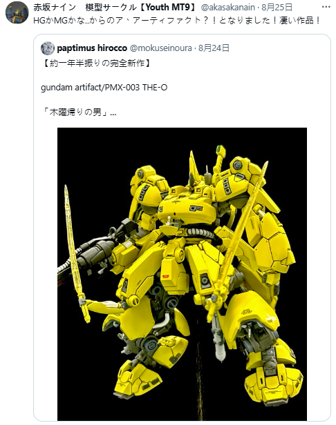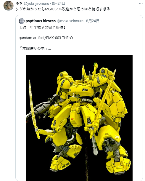 最近日本 X 上,有位推主 paptimus hirocco ( @mokuseinoura ) 分享了一款《機動戰士Z鋼彈》西羅克駕駛的「The・O」模型引發熱烈討論。因為看起來相當巨大,塗裝又相當精細,卻意外發現這居然只是一個約 5.5 公分的迷你尺寸,讓人驚嘆不已。