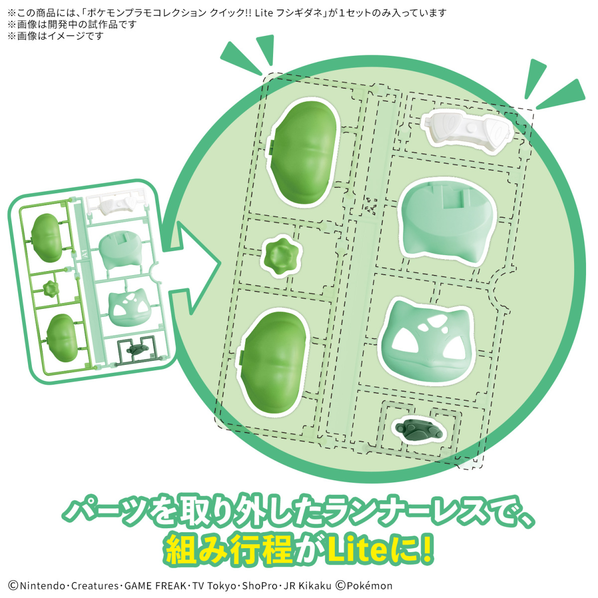 由一般快組版發展而來的『Pokémon PLAMO 收藏集 快組版!! Lite』系列,最大的特徵就是「省略從框架上取下零件」的無零件框設計,大幅縮短組裝完成所需的時間,並在極少零件數量下運用零件成型色大幅還原寶可夢的色彩,製作出全高約 8 公分的可愛模型。