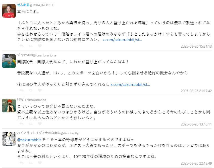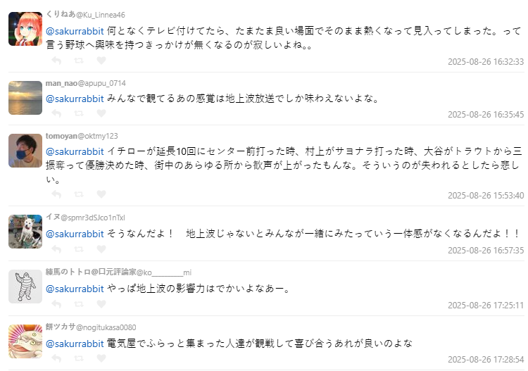 對於將棒球是為日本國球的民眾,認為如果沒有辦法在電視的地上波轉播看到,就少了那種舉國支持的氣氛。