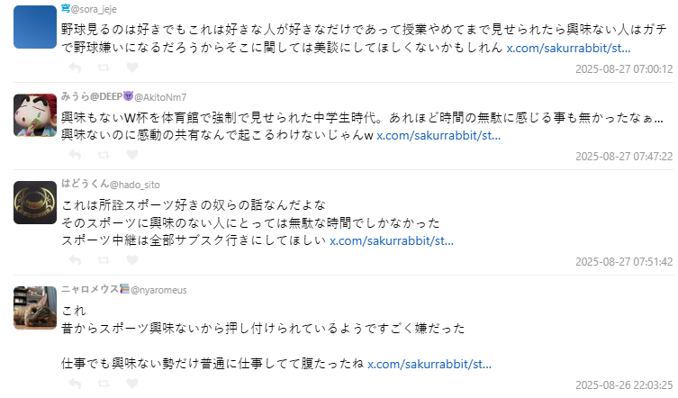不過,也有不少聲音反對「強迫全班或全國一起看」。有網友表示:「我對棒球沒興趣,小時候被迫在體育館看轉播,只覺得浪費時間。」還有人指出,當時的氛圍甚至會讓「不看、不應援的人」被當異類。不是每個人都想看比賽,把它美化成全民回憶,對沒興趣的人其實很痛苦。